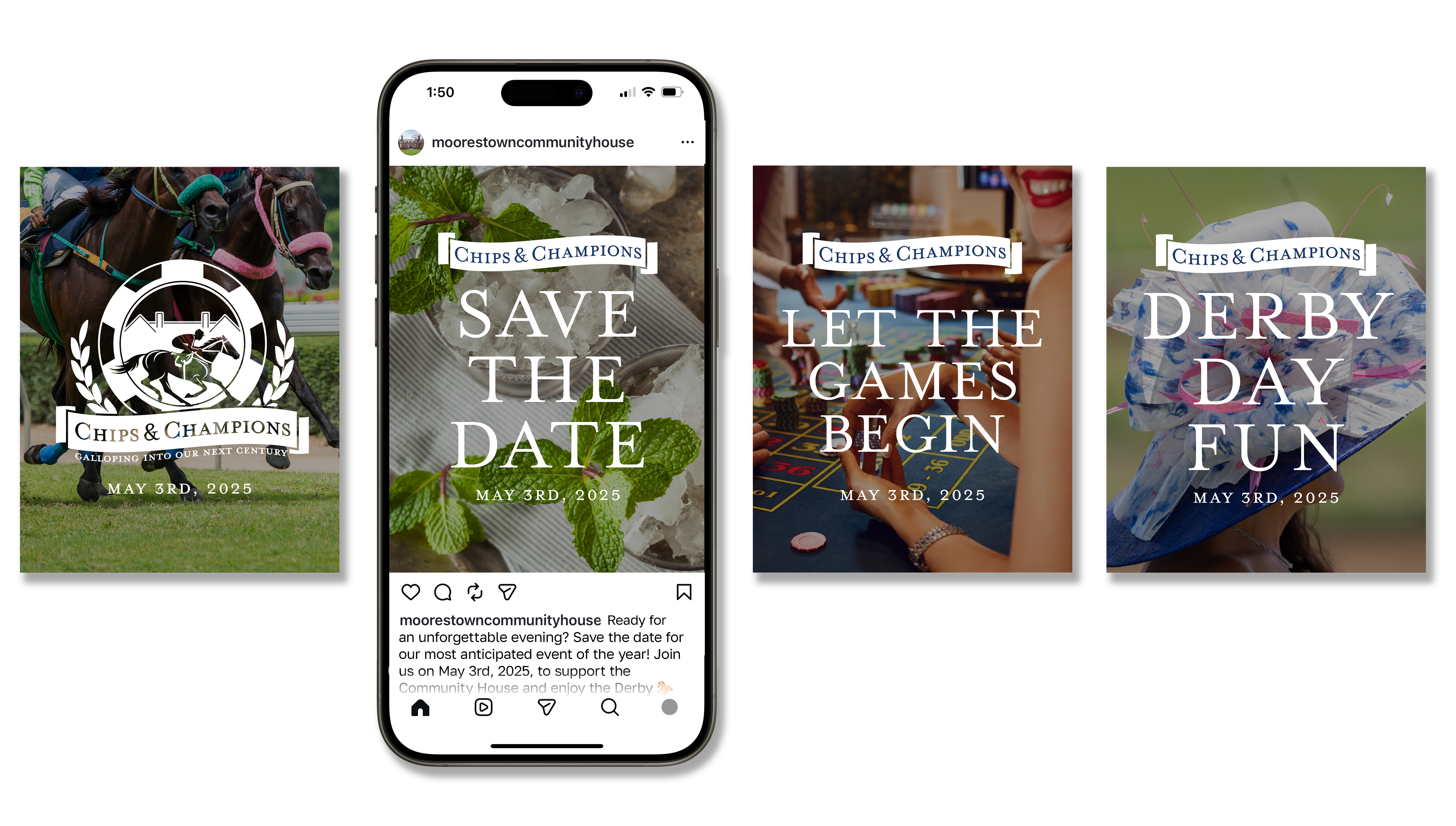 The Community House of Moorestown turned to Idea Lab Digital to create a unique look for their new fundraising event, "Chips and Champions: Galloping Into Our Next Century". This event combined Kentucky Derby style with a casino-night vibe, featuring mint juleps, gaming tables, and a live derby broadcast. The scope of work included event logotype, flyers, social media graphics, and an outdoor banner.