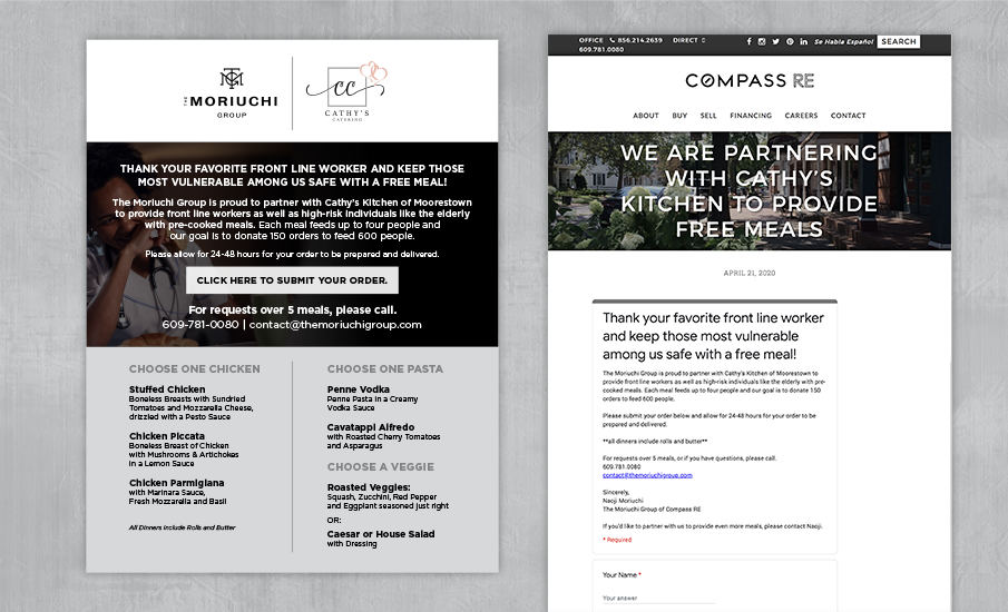 The Moriuchi Group prides themselves in community engagement and philanthropic endeavors. During this pandemic, TMG is proud to partner with Cathy’s Kitchen to provide those on the front lines in the medical field with pre-cooked meals. We helped TMG kickstart this campaign through a digital flyer and form submission on their site in order to serve the community and create brand recognition.