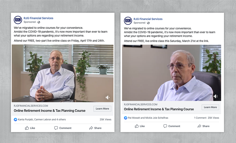 We collaborated with RJG to adjust their digital campaign by producing pre-roll ads. The purpose of these ads is to spread their timely message about taking financial planning courses for people 60+ from the comfort and safety of home. Along with advertising the online courses, ILD helped facilitate the transition from in-person to online by coaching RJG through the new virtual platform. With collaboration and urgency, all of this was done within a week of the client's intial request.